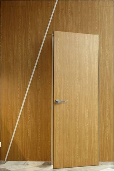 Петли, на которые крепится дверное полотно - скрытые. Поэтому двери полностью сливаются со стеной – они устанавливаются вровень с плоскостью стены, а декоративные наличники не применяются.